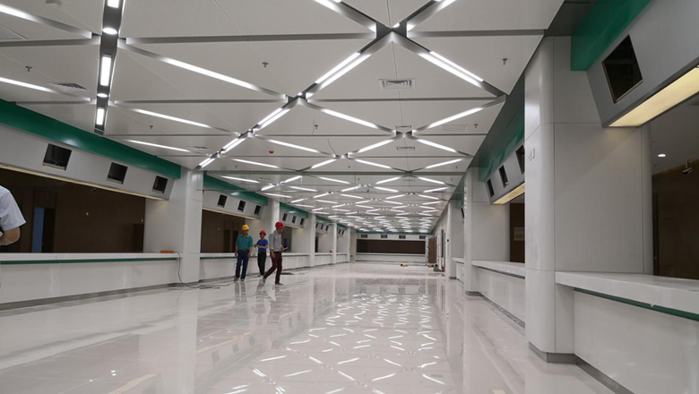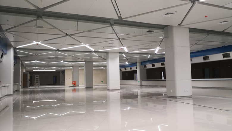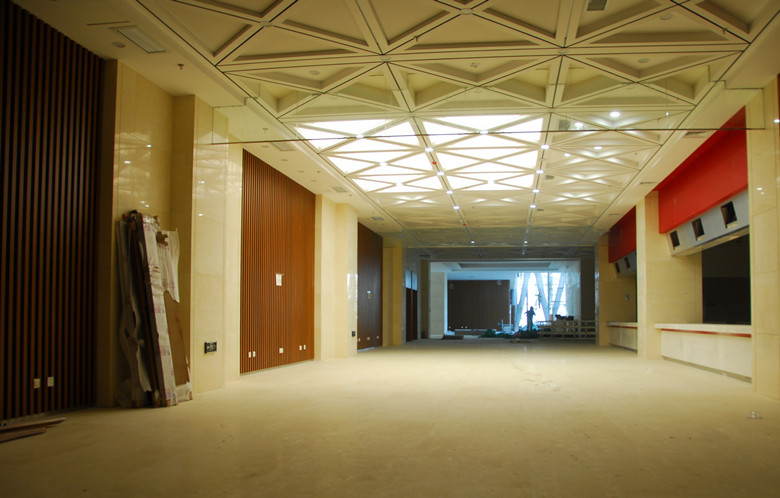 在選材方面,金鴻與設(shè)計師密切溝通,并定期派專人指導(dǎo),選取高品質(zhì)的優(yōu)質(zhì)環(huán)保材料,并一次性通過認可。施工中,金鴻發(fā)揮項目部技術(shù)優(yōu)勢,對工程中最重要的超寬異型鋁板吊頂工藝,提出了單塊分二、按軸線分組的模塊化施工方案,不僅解決了擋煙垂壁的安裝問題,而且使單塊鋁板的造價降低了百分之三十,節(jié)省了鋁板的定制周期。