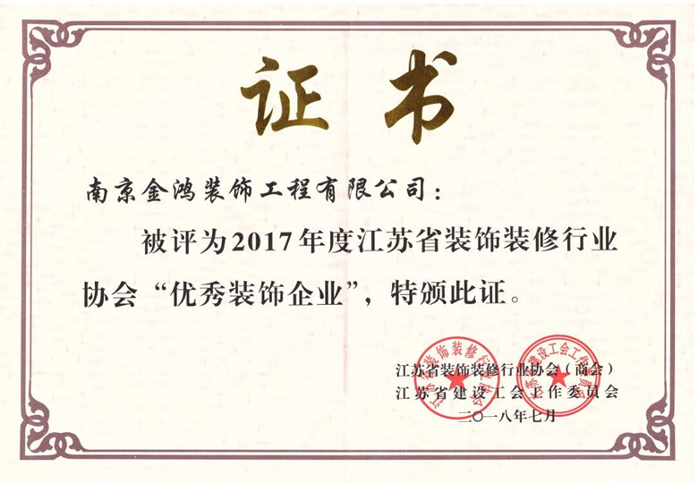 2018年7月27日,2018年中國(guó)建筑工程裝飾獎(jiǎng)迎檢工作會(huì)議暨頒獎(jiǎng)大會(huì)在南京召開(kāi)。會(huì)上,江蘇省裝飾協(xié)會(huì)領(lǐng)導(dǎo)進(jìn)行了國(guó)優(yōu)迎檢動(dòng)員,與會(huì)專家輔導(dǎo)裝飾、幕墻國(guó)優(yōu)工程迎檢準(zhǔn)備工作,同時(shí)舉辦了隆重的頒獎(jiǎng)儀式。我公司榮獲2017年“江蘇省優(yōu)秀裝飾企業(yè)榮譽(yù)”稱號(hào),該獎(jiǎng)項(xiàng)充分肯定了我公司在建筑裝飾裝修領(lǐng)域所取得的成就。我公司王洋等八位同志被授予“2017年度江蘇省裝飾裝修工程優(yōu)秀項(xiàng)目經(jīng)理”,該獎(jiǎng)項(xiàng)是對(duì)近年來(lái)立足崗位、積極發(fā)揮技術(shù)專長(zhǎng)、努力爭(zhēng)先創(chuàng)優(yōu)并做出顯著貢獻(xiàn)和業(yè)績(jī)的項(xiàng)目經(jīng)理的充分肯定。