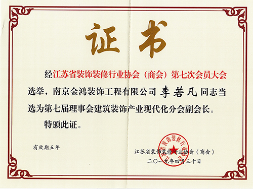 《建筑裝飾產(chǎn)業(yè)現(xiàn)代化分會(huì)副會(huì)長(zhǎng)》榮譽(yù)證書