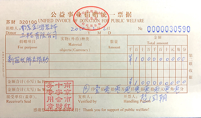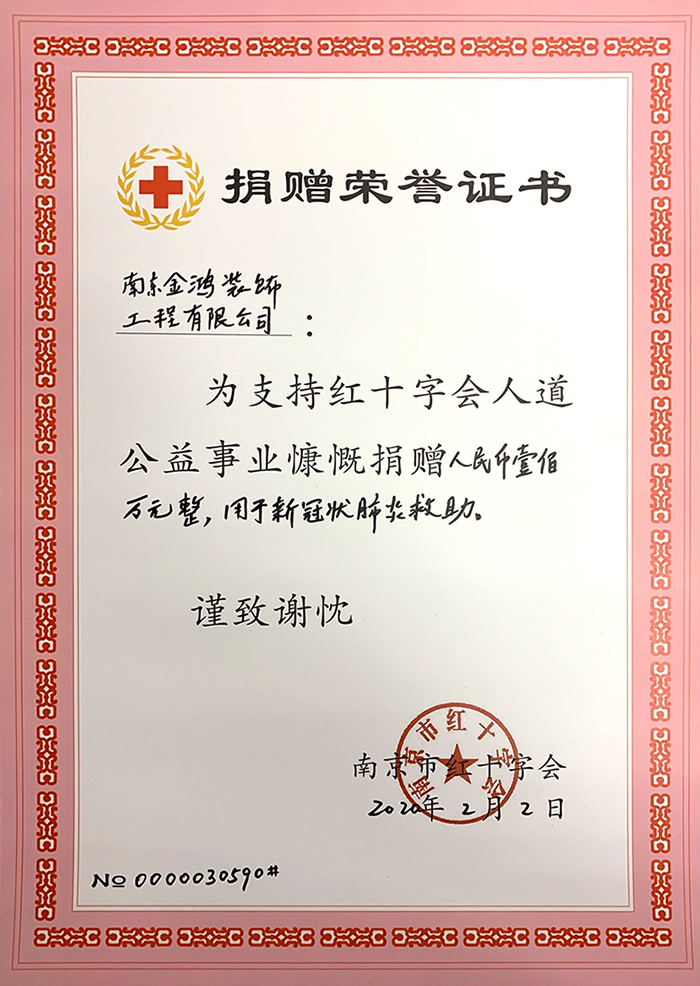 連日來,以湖北武漢為中心的新型冠狀病毒肺炎感染疫情在全國多地爆發(fā)。2月2日,中國建筑裝飾協(xié)會副會長、南京金鴻裝飾工程有限公司董事長徐榮先生代表金鴻裝飾向南京市紅十字會捐贈人民幣100萬元,此捐贈款項將作為疫情防控??钍褂?。